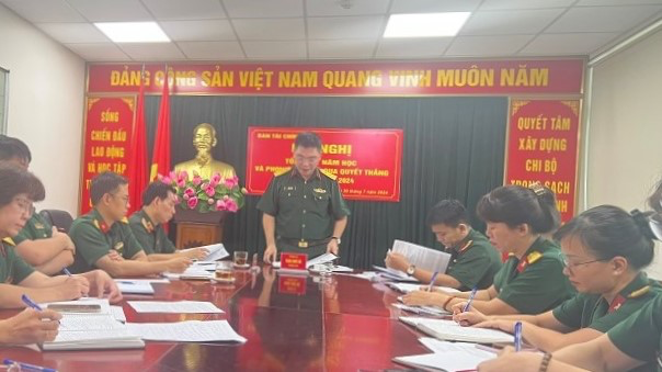 Mở đầu Hội nghị, Trung tá Thân Như Hà – Trưởng ban Tài chính đã trình bày dự thảo Báo cáo Tổng kết năm học 2023-2024 và dự thảo Báo cáo Tổng kết phong trào TĐQT năm học 2023-2024. Các báo cáo nêu bật các kết quả đạt được và những tồn tại, hạn chế trong thực hiện nhiệm vụ và phong trào TĐQT năm học 2023-2024; đồng thời đề ra phương hướng, mục tiêu, nhiệm vụ chủ yếu trong năm học 2024-2025.