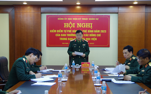Thực hiện Công văn số 2980/CT-TC ngày 07/10/2023 của Tổng cục Chính trị về việc kiểm điểm, đánh giá, xếp loại chất lượng tổ chức đảng, đảng viên năm 2023 và ra nghị quyết năm 2024, ngày 12/12/2023, Ban Thường vụ Đảng ủy Học viện đã tổ chức Hội nghị Kiểm điểm tự phê bình và phê bình năm 2023. Thiếu tướng Trần Văn Thưởng – Bí thư Đảng ủy, Chính ủy Học viện chủ trì Hội nghị. Tham dự Hội nghị có các đồng chí trong Ban Thường vụ Đảng ủy, Ban Giám đốc Học viện; đồng chí Phó Chủ nhiệm Chính trị, Phó Chủ nhiệm Ủy ban Kiểm tra Đảng ủy Học viện.