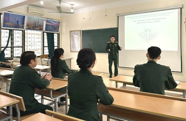 Thực hiện kế hoạch sinh hoạt học thuật bằng ngoại ngữ, sáng 21/11/2022, Bộ môn Xây dựng Nhà và Công trình công nghiệp/Viện Kỹ thuật Công trình đặc biệt đã tổ chức buổi sinh hoạt học thuật bằng tiếng Anh với chủ đề “Công nghệ giảm chấn thời cổ đại” (The ancient anti-earthquake architectural model) do Đại úy ThS Lê Hoàng Long – Giáo viên Bộ môn thuyết trình. Trung tá Phạm Thanh Bình – Phó Chủ nhiệm Bộ môn chủ trì buổi sinh hoạt cùng với sự tham gia của đông đủ giáo viên trong Bộ môn.