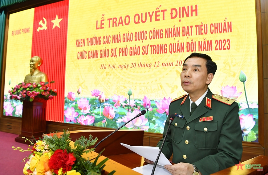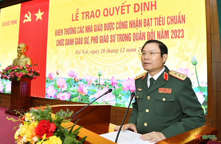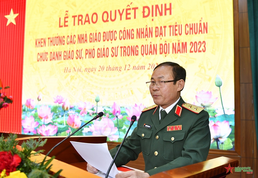 Phát biểu tại buổi lễ, thay mặt Quân ủy Trung ương, Bộ Quốc phòng, Thượng tướng Nguyễn Tân Cương đánh giá cao các cơ quan chức năng, học viện, nhà trường Quân đội đã có nhiều cố gắng để nâng cao chất lượng giáo dục và đào tạo, nhất là năm 2023 đã xây dựng triển khai 4 đề án về công tác giáo dục, đào tạo; xây dựng chuẩn đầu ra và có nhiều đổi mới để nâng cao chất lượng học viên ra trường, nâng cao chất lượng đội ngũ nhà giáo, cán bộ quản lý giáo dục. Đồng thời chúc mừng 3 GS, 47 PGS vừa được Hội đồng GS Nhà nước công nhận. Đây thực sự là những nhà giáo, nhà khoa học mẫu mực, tiêu biểu về phẩm chất đạo đức, tác phong công tác trong giảng dạy và nghiên cứu khoa học.