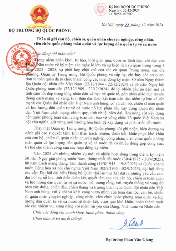 Ngày 22/12, Đại tướng Phan Văn Giang – Ủy viên Bộ Chính trị, Phó Bí thư Quân ủy Trung ương, Bộ trưởng Bộ Quốc phòng đã gửi thư động viên cán bộ, chiến sĩ, quân nhân chuyên nghiệp, công nhân, viên chức quốc phòng toàn quân và lực lượng dân quân tự vệ cả nước đã có nhiều đóng góp công sức, trí tuệ cho thành công của các hoạt động kỷ niệm. Dưới đây là nội dung toàn văn: