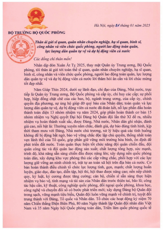 Nhân dịp năm mới Ất Tỵ 2025, thay mặt Quân ủy Trung ương, Bộ Quốc phòng, Đại tướng Phan Văn Giang, Ủy viên Bộ Chính trị, Phó Bí thư Quân ủy Trung ương, Bộ trưởng Bộ Quốc phòng gửi Thư chúc Tết sĩ quan, quân nhân chuyên nghiệp, hạ sĩ quan, binh sĩ, công nhân và viên chức quốc phòng, người lao động toàn quân, lực lượng dân quân tự vệ và dự bị động viên cả nước.Dưới đây là toàn văn Thư chúc Tết của Bộ trưởng Bộ Quốc phòng.