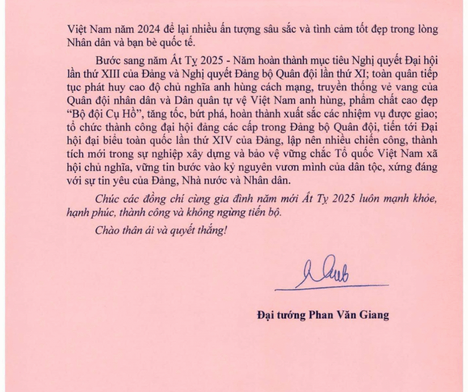 Nhân dịp đón Xuân Ất Tỵ 2025, thay mặt Quân ủy Trung ương, Bộ Quốc phòng, tôi thân ái gửi tới toàn thể sĩ quan, quân nhân chuyên nghiệp, hạ sĩ quan, binh sĩ, công nhân và viên chức quốc phòng, người lao động toàn quân, lực lượng dân quân tự vệ và dự bị động viên cả nước lời thăm hỏi ân cần và lời chúc mừng tốt đẹp nhất.