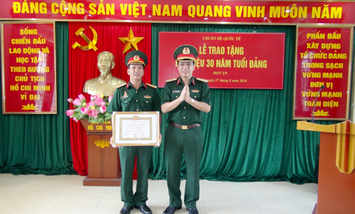 Thực hiện điều lệ Đảng Cộng sản Việt Nam và Quy định 29-QĐ/TW ngày 25/7/2016 của Ban chấp hành Trung ương về “Thi hành điều lệ Đảng” và hướng tới kỷ niệm chào mừng 73 năm Quốc khánh 2/9, chiều 27/8, Chi bộ Hệ Quốc tế đã long trọng tổ chức Lễ trao tặng Huy hiệu 30 năm tuổi Đảng cho Đại tá Nguyễn Minh Hồng – Chính trị viên Hệ Quốc tế. Tới dự có Thiếu tướng Phạm Ngọc Thắng – Đảng ủy viên, Phó Chính ủy Học viện cùng các đồng chí đảng viên đang sinh hoạt tại Chi bộ.