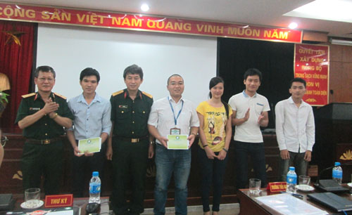 Thiếu tướng Nguyễn Thiện Chất và Đại tá Lê Kỳ Nam trao thưởng cho đội vô địch và đội á quân Softcon 2014
