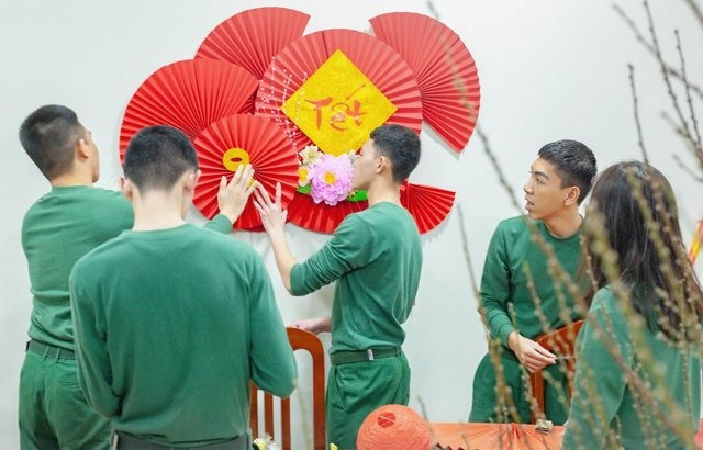Tết đã đến ngày càng gần, cảnh quan đơn vị cũng được trang trí ngày càng rực rỡ. Trên hành lang, trong phòng sinh hoạt nổi bật lên sắc hồng của đào, sắc vàng của mai, sắc đỏ của câu đối. Tất cả đã tạo nên một không khí xuân ấm cúng, yên vui, một sắc màu xuân tươi đẹp, rực rỡ.