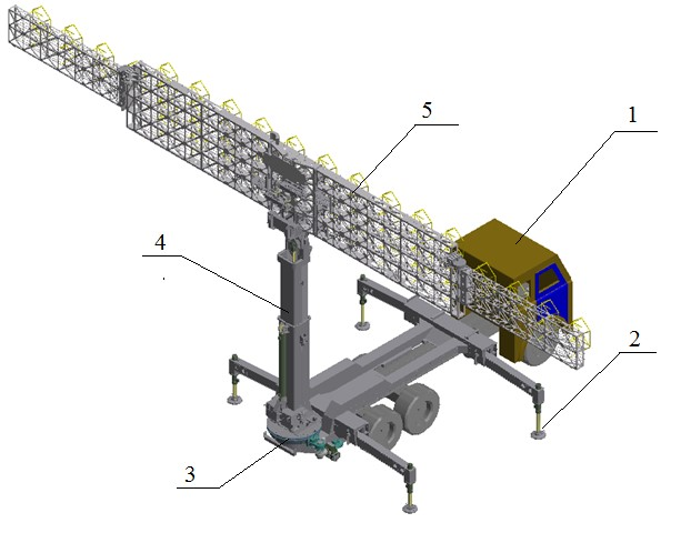 1- Xe cơ sở; 2- Hệ thống thủy lực nâng/hạ, cân bằng; 3- Bệ quay;