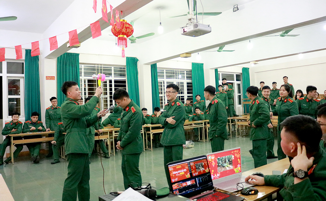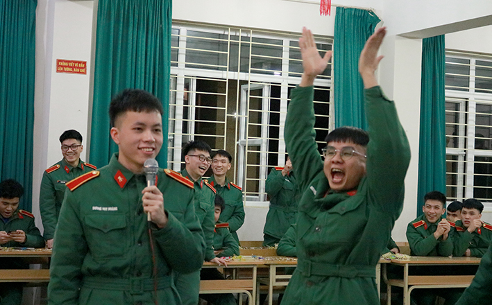 Đặc biệt khác so với những đơn vị bạn, do tình hình diễn biến phức tạp của dịch Covid-19 và đang trong thời gian thực tập, toàn thể học viên Đại đội 355/Tiểu đoàn 3/ Học viện KTQS đã có cơ hội được đón Tết tại Trung tâm Huấn luyện 125 Vĩnh Phúc. Đêm giao thừa, tại phòng 205-H3, Đại đội 355 đã tổ chức Chương trình đón Xuân đầy ý nghĩa. Mở đầu chương trình, các học viên được xem Thời sự, Chương trình Gặp nhau cuối năm và video “Nhìn lại một năm” cùng những tiết mục văn nghệ sôi động. Để khuấy động không khí và xua đi nỗi nhớ nhà, các học viên được chia theo lớp tham gia 03 trò chơi: “Hái hoa dân chủ”, “Đuổi hình bắt chữ”, “Đội chơi hoàn hảo”. Bên cạnh những phần thưởng hấp dẫn, các đội chơi còn được thể hiện khả năng làm việc nhóm và sở trường của bản thân. Bằng sự nhanh nhẹn và ăn ý, Chi đoàn Tác chiến điện tử đã xuất sắc giành được giải Nhất với kết quả hết sức thuyết phục.