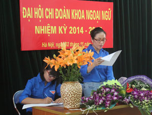 Tại Đại hội, đồng chí Nguyễn Thị Hoài Thu – Bí thư Chi đoàn nhiệm kỳ 2012 – 2014 đã thay mặt Ban chấp hành Chi đoàn đọc Báo cáo tổng kết công tác đoàn và phong trào thanh niên nhiệm kỳ 2012 – 2014 và phương hướng hoạt động nhiệm kỳ 2014 – 2017. Báo cáo đã chỉ ra những khó khăn, thuận lợi, ưu điểm, hạn chế và những kết quả hoạt động của Chi đoàn trong nhiệm kỳ qua, từ đó đặt ra những mục tiêu, nhiệm vụ cụ thể cho Chi đoàn trong nhiệm kỳ tới. Là một Chi đoàn giáo viên, 100% là nữ, có 2/3 đoàn viên đang nuôi con nhỏ, các đoàn viên trong Chi đoàn lại đảm trách công tác giảng dạy với tải giảng cao, nhưng nêu cao tinh thần “nhiệm vụ nào cũng hoàn thành, khó khăn nào cũng vượt qua”, Chi đoàn Khoa Ngoại ngữ đã xung kích, sáng tạo trong mọi hoạt động, xứng đáng là “cánh tay phải” đắc lực, góp phần không nhỏ thực hiện thành công nhiệm vụ chính trị của Đảng ủy Khoa.