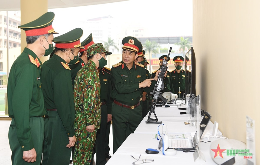 Buổi sáng, Đại tướng Phan Văn Giang dành thời gian tham quan, kiểm tra kết quả nghiên cứu khoa học, các sản phẩm khoa học của Học viện. Tại khu vực trưng bày sản phẩm “Súng bắn hai môi trường”, sau khi Thiếu tá Nguyễn Văn Hưng – giảng viên Bộ môn Vũ khí/Khoa Vũ khí, báo cáo cấu tạo, tính năng kỹ thuật, chiến thuật của súng, đồng chí Bộ trưởng đưa tay kéo khóa nòng với động tác mạnh, dứt khoát, nghiêng mặt súng xem các chi tiết rồi đề nghị nhóm đề tài cần nghiên cứu chỉnh sửa một số cấu tạo của súng để người dùng dễ sử dụng.