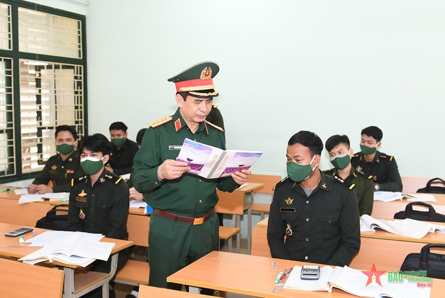 Đại tướng Phan Văn Giang kiểm tra và ân cần hỏi thăm, động viên học viên nước bạn Lào, Campuchia đang học tập tại Học viện KTQS (Ảnh: TRỌNG HẢI)