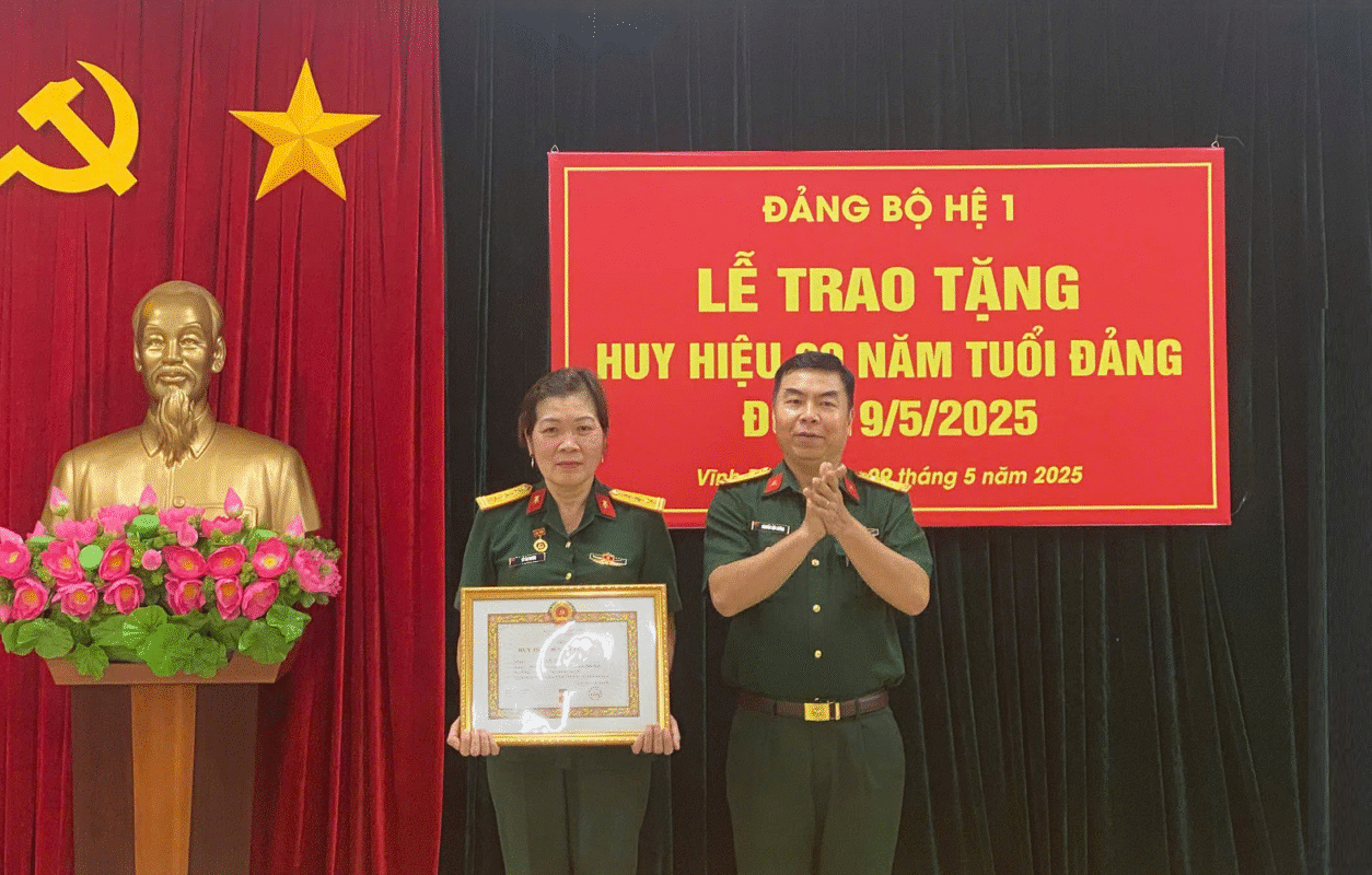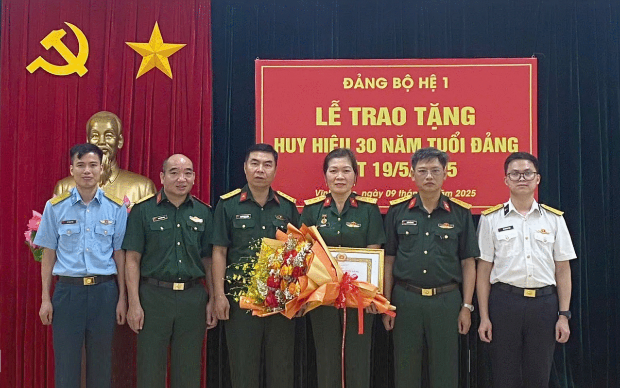 Thực hiện Quyết định số 3757-QĐ/QUTW ngày 22/4/2025 của Quân ủy Trung ương về tặng Huy hiệu Đảng đợt 19/5/2025, chiều 09/5, Đảng Bộ Hệ 1 đã tổ chức Lễ trao tặng Huy hiệu 30 năm tuổi Đảng cho Thượng tá QNCN Lê Thị Duyên – Nhân viên văn thư, đảng viên đang sinh hoạt tại Chi bộ Lớp Đào tạo văn bằng 2. Tham dự buổi Lễ có các đồng chí trong Đảng ủy, Chỉ huy Hệ cùng toàn thể đảng viên trong Đảng bộ.