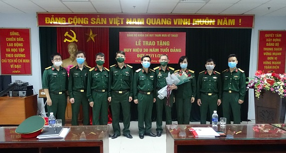 Được sự nhất trí của Thường vụ Đảng ủy Học viện, sáng 04/11/2021, Đảng bộ Khoa Chỉ huy Tham mưu kỹ thuật (CHTMKT) đã trang trọng tổ chức Lễ trao tặng Huy hiệu 30 năm tuổi Đảng cho Đại tá Nguyễn Phú Vinh – Đảng viên Chi bộ Bộ môn Bảo đảm Thông tin và Cơ yếu (BĐTT&CY). Tham dự buổi Lễ có Thiếu tướng Lê Minh Thái – Ủy viên Thường vụ, Phó Giám đốc Học viện; các đồng chí trong Đảng ủy, chỉ huy Khoa CHTMKT cùng toàn thể đảng viên trong Đảng bộ.