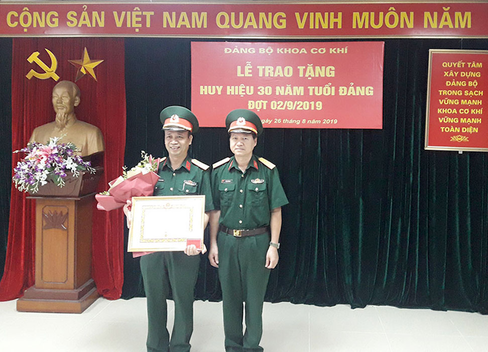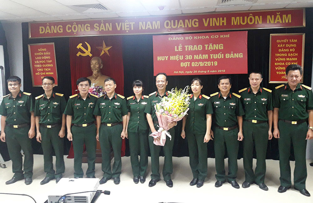 Thực hiện Quyết định Số 800-QĐ/QUTW ngày 05 tháng 8 năm 2019 của Thường vụ Quân ủy Trung ương về việc trao Huy hiệu 30 năm tuổi Đảng, chiều 26/08/2019, Đảng bộ Khoa Cơ khí đã long trọng tổ chức Lễ trao tặng Huy hiệu 30 năm tuổi Đảng cho đồng chí Nguyễn Trung Định – Đảng uỷ viên Đảng uỷ Khoa Cơ khí, Chủ nhiệm Bộ môn Nhiệt Thuỷ khí.