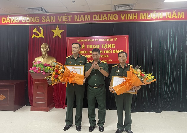Thực hiện Quyết định số 3024-QĐ/QUTW ngày 06/8/2024 của Ban Thường vụ Quân ủy trung ương về việc trao tặng Huy hiệu 30 năm tuổi Đảng đợt 02/9/2024, chiều 28/8, Đảng bộ Khoa Vô tuyến điện tử (VTĐT) đã tổ chức Lễ trao tặng Huy hiệu 30 năm tuổi Đảng cho Đại tá Kiều Khắc Phương – Giảng viên Bộ môn Cơ sở kỹ thuật vô tuyến và Thượng tá QNCN Nguyễn Quang Trung – Kỹ thuật viên Bộ môn Ra đa.