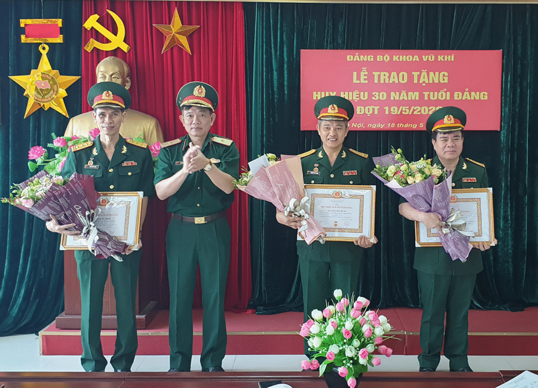 Các đồng chí được trao tặng Huy hiệu 30 năm tuổi Đảng đợt này của Đảng bộ Khoa Vũ khí, gồm: Đại tá Nguyễn Thái Dũng – Chi bộ Trung tâm Kỹ thuật vũ khí; Đại tá Nguyễn Viết Trung và Thượng tá Trần Quốc Trình – Chi bộ Bộ môn Vũ khí.