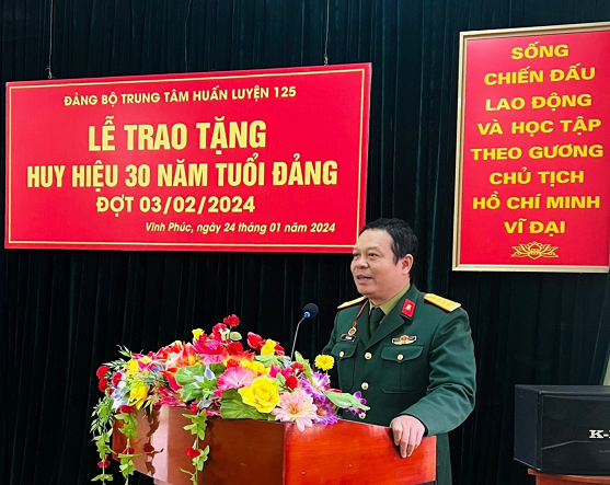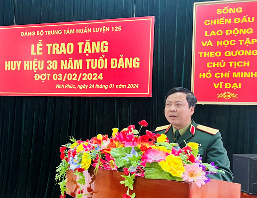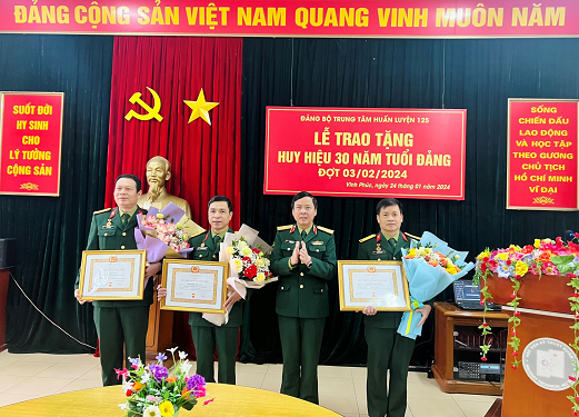 Chiều 24/01/2024, Đảng bộ Trung tâm Huấn luyện 125 đã tổ chức Lễ trao tặng Huy hiệu 30 năm tuổi Đảng đợt 03/02/2024 cho các đồng chí: Đại tá Bùi Sơn Nam – Phó Bí thư Đảng ủy, Trưởng Trung tâm Huấn luyện 125 Vĩnh Phúc; Thượng tá Nguyễn Cao Tuế – Phó Bí thư Chi bộ Tham mưu – Chính trị, Trưởng ban Chính trị/Trung tâm Huấn luyện 125 Vĩnh Phúc và Thượng tá CN Cao Khắc Thường – đảng viên, nhân viên Ban Chính trị/Trung tâm Huấn luyện 125 Vĩnh Phúc.