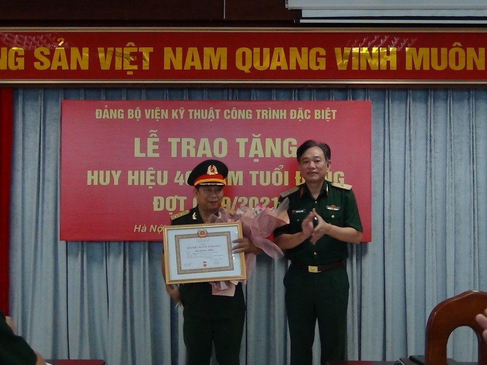 Được sự nhất trí của Thường vụ Đảng ủy Học viện, chiều 30/9/2021, Đảng bộ Viện Kỹ thuật công trình đặc biệt (KTCTĐB) đã trang trọng tổ chức Lễ trao tặng Huy hiệu 40 năm tuổi Đảng cho Đại tá Nguyễn Duy Đồng – đảng viên Chi bộ Bộ môn Cầu đường Sân bay. Tham dự buổi Lễ có Thiếu tướng Nguyễn Lạc Hồng – Ủy viên Thường vụ, Phó Giám đốc Học viện; các đồng chí trong Đảng ủy Viện KTCTĐB cùng toàn thể đảng viên trong Đảng bộ.