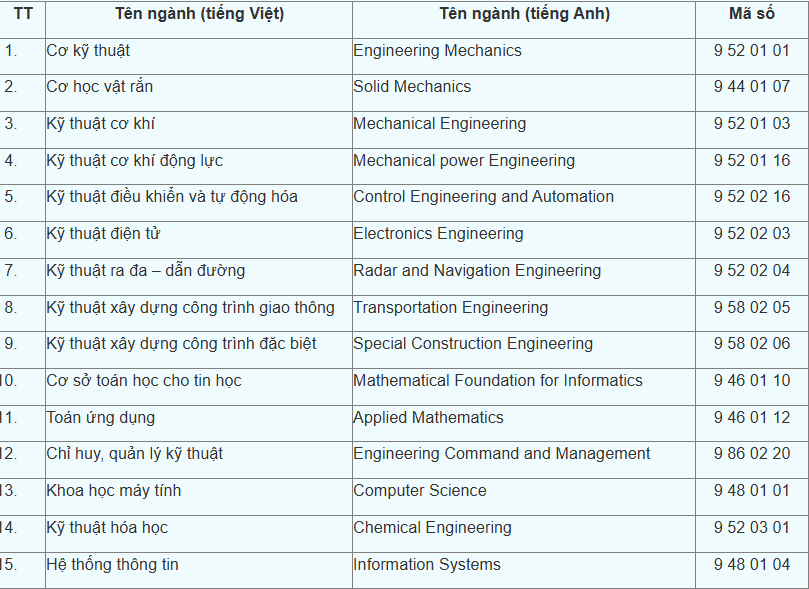 | 1 | Cơ kỹ thuật | Engineering Mechanics | 9 52 01 01 |