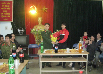 Sau trận giao hữu bóng chuyền, cán bộ, đoàn viên 2 đơn vị đã tập trung về Phòng Hồ Chí Minh Tiểu đoàn 2 để giao lưu văn nghệ. Đồng chí Nguyễn Văn Quân thay mặt Đội sinh viên tự quản Ký túc xá Đại học Sư phạm Hà Nội gửi tới Ban Chấp hành ĐCS Tiểu đoàn 2 bó hoa tươi thắm cùng lời chúc mừng với những tình cảm tốt đẹp nhất. Tiếp nhận tình cảm đó, đồng chí Nguyễn Đình Nguyên đã thay mặt cho tuổi trẻ ĐCS Tiểu đoàn 2 bày tỏ mong muốn trong thời gian tới, hai đơn vị sẽ có nhiều hoạt động phối hợp với nhau tốt hơn nữa nhằm thắt chặt tình cảm gắn bó giữa hai đơn vị, góp phần vào việc thúc đẩy hoạt động công tác đoàn và phong trào thanh niên của hai đơn vị đi vào chiều sâu, nhất là các hoạt động bồi dưỡng lý tưởng sống và kỹ năng cho ĐVTN.