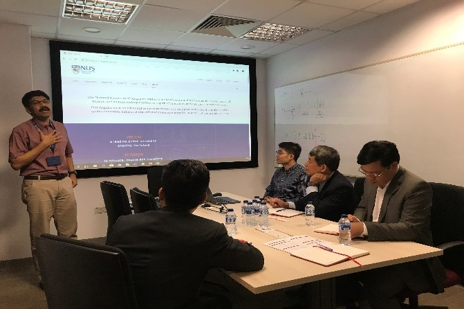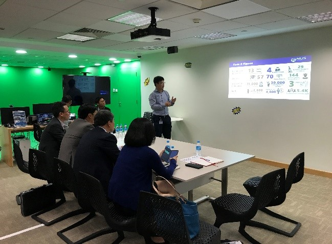 Đại học Quốc gia Singapore – NUS (National University of Singapore) là một trường đại học hàng đầu thế giới (đứng thứ 11 trong Bảng xếp hạng các trường đại học trên thế giới năm 2019 theo QS World University Ranking; “Trường đại học tốt nhất châu Á” theo Bảng xếp hạng đại học Châu Á. NUS đứng vị trí thứ 22 theo Bảng xếp hạng Đại học Thế giới của THE năm 2018). NUS có số lượng sinh viên lớn, kết quả nghiên cứu khoa học – công nghệ rất ấn tượng (theo Báo cáo năm 2018 của NUS: Năm 2017-2018 có tổng số 35.908 sinh viên ở các bậc học; năm 2017 đã công bố 9.789 bài báo khoa học đạt chuẩn ISI/Scopus; năm 2017 đã hoàn thành 1.287 đề tài/dự án và thực hiện 625 đề tài/dự án mới; tổng số cán bộ/nhân viên của NUS là 12.018, trong đó: 2.555 công tác tại các khoa/viện, số cán bộ nghiên cứu là 3.947). NUS tập trung vào ba trụ cột “Giáo dục – Nghiên cứu – Khởi nghiệp” nhằm thay đổi cuộc sống và tạo ra một hệ sinh thái đổi mới và khởi nghiệp mạnh mẽ ở Singapore, Đông Nam Á. NUS ưu tiên nghiên cứu về Khoa học y sinh và y học tiên tiến; Năng lượng và môi trường, Giải pháp đô thị bền vững; Tài chính và quản lý rủi ro; Khoa học vật liệu; Nghiên cứu hàng hải… Tại NUS, Đoàn công tác đã được giới thiệu, trao đổi kinh nghiệm về công nghệ giáo dục hiện đại (phát triển và sử dụng học liệu số, ứng dụng CNTT trong giảng dạy và học tập, ứng dụng sư phạm thông minh và giảng dạy thông minh); Kinh nghiệm xây dựng Kho Tài nguyên học tập số (Learning Object Repository) nội sinh tại Phòng đa phương tiện (Multimedia) của Trung tâm Phát triển Giảng dạy và Học tập (Center for Development of  Teching and Learning); Thăm Thư viện Trung tâm và trao đổi kinh nghiệm về phần mềm quản trị thư viện, khai thác CSDL điện tử trực tuyến, việc trang bị và sử dụng các thiết bị công nghệ cao (máy in 3D, camera chuyên dụng, công nghệ VR/AR, phòng studio…) để phục vụ người dùng tin tại thư viện.