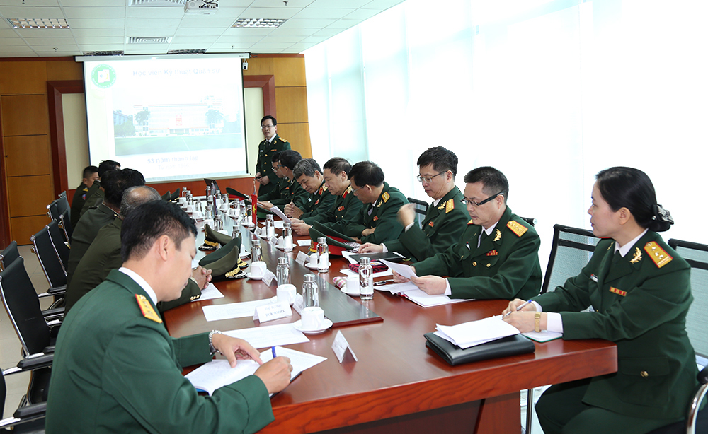 Tại buổi làm việc, Đoàn đã được nghe giới thiệu về Học viện KTQS với lịch sử hơn 50 năm xây dựng và trưởng thành, về tình hình học tập và rèn luyện của học viên quân sự Campuchia tại Học viện. Cũng trong chương trình làm việc, Đoàn đã gặp gỡ với các học viên quân sự Campuchia đang học tập tại Học viện KTQS.