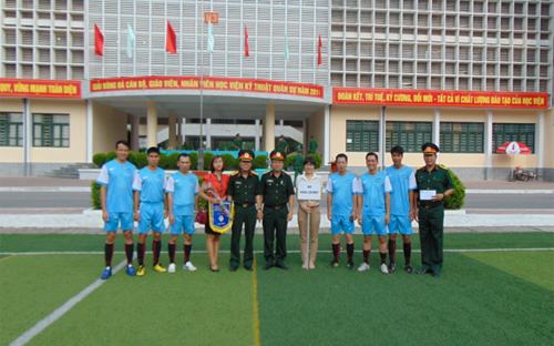 Thiếu tướng Nguyễn Ngọc Sơn – Phó Giám đốc Học Viện và Đại tá Hướng Xuân Thạch – Chủ nhiệm Khoa chụp ảnh lưu niệm cùng đội bóng Khoa CHTMKT trong trận đấu khai mạc