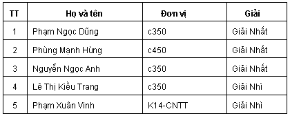 Đội tuyển của Học viện tham dự kỳ thi năm nay gồm 8 thí sinh, trong đó nổi bật là học viên Phạm Ngọc Dũng – c350, Tiểu đoàn 3, đạt giải Nhất môn Giải tích và giải Nhì môn Đại số. Đáng chú ý là trong thành phần đội tuyển có 2 thí sinh nữ tham dự ở hai nội dung và cùng đạt giải Nhì. Đây là lần đầu tiên Học viện có thí sinh nữ đạt giải chính thức ở kỳ thi Olympic Toán học toàn quốc. Ngoài ra, đội tuyển có một sinh viên hệ dân sự Khóa 14 ngành CNTT tham gia thi môn Giải tích và đạt giải Nhì, qua đó khẳng định năng lực của các sinh viên và chất lượng đào tạo hệ dân sự của Học viện.