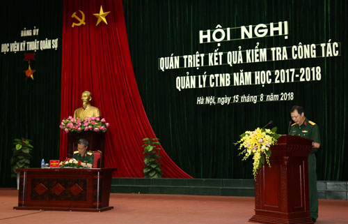 Sáng 15/8, Đảng ủy Học viện KTQS tổ chức Hội nghị Quán triệt kết quả kiểm tra công tác quản lý chính trị nội bộ năm học 2017 – 2018. Tham dự Hội nghị có các đồng chí trong Đảng ủy, Ban Giám đốc Học viện; Chỉ huy trưởng, Bí thư đầu mối trực thuộc Học viện. Thiếu tướng Cao Minh Tiến – Bí thư Đảng ủy, Chính ủy Học viện chủ trì Hội nghị.