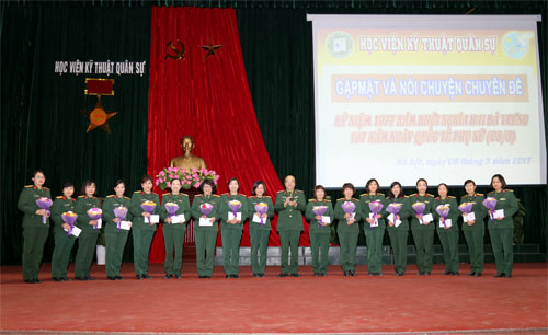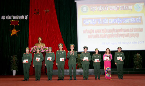 Thay mặt Đảng ủy, Ban Giám đốc Học viện, Đại tá Cao Minh Tiến đã gửi những lời chúc tốt đẹp đến các chị em trong toàn Học viện nhân Ngày Quốc tế Phụ nữ 8/3 và biểu dương những thành tích, sự đóng góp của các thế hệ phụ nữ Học viện vào sự nghiệp xây dựng Quân đội và xây dựng Học viện KTQS. Đồng chí tin tưởng rằng trên các lĩnh vực công tác, học tập, chị em phụ nữ Học viện sẽ luôn phát huy truyền thống, tính năng động sáng tạo, nỗ lực phấn đấu vươn lên, ngày càng khẳng định vai trò và vị thế của mình, tiếp tục nêu cao truyền thống tốt đẹp của người Phụ nữ Việt Nam, luôn đổi mới và đóng góp tích cực vào sự nghiệp giáo dục chung của đất nước, hoàn thành xuất sắc nhiệm vụ mà Đảng, Nhà nước, Quân đội, Học viện giao phó; xây dựng gia đình “No ấm, tiến bộ, hạnh phúc – bền vững”. Nhân dịp này, đồng chí Chính ủy Học viện cũng đã trao tặng Kỷ niệm chương Vì sự phát triển của Phụ nữ Việt Nam cho 10 đồng chí là cán bộ chỉ huy, lãnh đạo và các đồng chí là cán bộ trong Ban chấp hành Hội, hội viên có những đóng góp cho sự bình đẳng giới và sự phát triển của phụ nữ cũng như tham gia tích cực vào hoạt động của Hội LHPN Việt Nam.