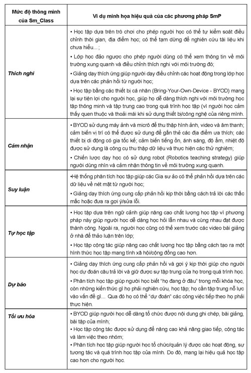 (2) SmP là các phương pháp giảng dạy có sự hỗ trợ của các thiết bị và công nghệ thông minh (được trang bị trong phòng học thông minh – Sm_Class) giúp các trường đạt được các mức độ phát triển [2] (Thích nghi, cảm nhận, suy luận, dự đoán, tự học tập, tự tối ưu hóa) của Sm_Class, SmU. (tham khảo chi tiết tại mục 1.2.4 chuyên san Đại học thông minh [1]).