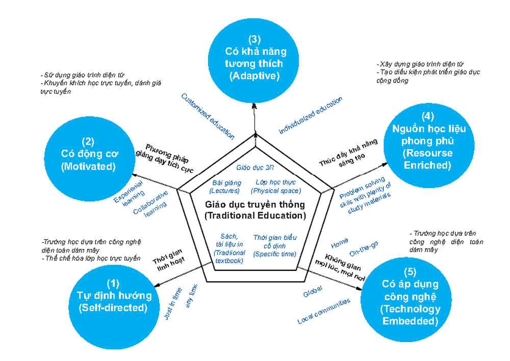 Thuật ngữ “Smart Education” không chỉ hàm ý một nền giáo dục “thông minh”, mà hơn thế nữa, S-M-A-R-T còn là từ viết tắt để diễn tả các đặc trưng của SmE, đó là: (1) Self-directed (Tự định hướng); (2) Motivated (Có động cơ); (3) Adaptive (Có khả năng tương thích), (4) Resource enriched (Có nguồn học liệu phong phú) và (5) Technology embedded (Có áp dụng công nghệ).