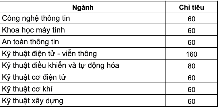 Chỉ tiêu đào tạo đại học được phân bổ cho 8 ngành, trong đó, Kỹ thuật điện tử – viễn thông, ngành đào tạo nhân sự trực tiếp cho lĩnh vực vi mạch bán dẫn, sẽ tuyển nhiều sinh viên nhất – 160. Tuy nhiên, trường chưa công bố học phí cụ thể.