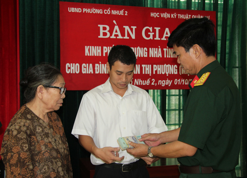 Hướng tới kỷ niệm 70 năm ngày thành lập Quân đội nhân dân Việt Nam (22/12/1944 – 22/12/2014), ngày 01/10, Học viện KTQS phối hợp với Đảng uỷ, UBND phường Cổ Nhuế 2 – Bắc Từ Liêm – Hà Nội tổ chức trao tặng số tiền 70.000.000 đồng cho Ban chỉ đạo xây dựng Nhà tình nghĩa phường Cổ Nhuế 2, để xây dựng nhà tình nghĩa cho gia đình bà Trần Thị Phượng – mẹ của liệt sỹ Đỗ Đức Trung, hy sinh trong chiến tranh Biên giới phía Bắc.
