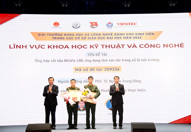Vượt qua hơn 70 đề tài thuộc lĩnh vực Khoa học kỹ thuật và công nghệ, nhóm học viên của Học viện KTQS gồm: Nguyễn Hoàng Đức, Vi Thái Bình (Lớp Phòng hóa 54) cùng giảng viên hướng dẫn – Trung tá TS Nguyễn Trung Dũng – Bộ môn Kỹ thuật Môi trường/Khoa Hoá – Lý kỹ thuật đã xuất sắc giành giải Nhất với đề tài “Tổng hợp vật liệu NiCoFe-LDO, ứng dụng làm xúc tác trong xử lý môi trường”. Nội dung đề tài đã được công bố trên tạp chí Separation and purification technology (ISI, Q1, IF= 9,136).