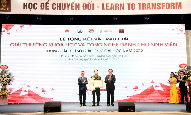 Ngày 09/12, tại trường Đại học Hà Nội (HANU) đã diễn ra Lễ tổng kết và trao giải Giải thưởng Khoa học và Công nghệ (KH&CN) dành cho sinh viên trong các cơ sở giáo dục đại học năm 2022 do Bộ Giáo dục và Đào tạo phối hợp với Trung ương Đoàn Thanh niên Cộng sản Hồ Chí Minh, Bộ KH&CN, Quỹ Hỗ trợ Sáng tạo Kỹ thuật Việt Nam (VIFOTEC) triển khai.