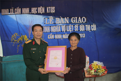 Hướng tới kỷ niệm 69 năm Ngày thành lập Quân đội nhân dân Việt Nam (22/12/1944 – 22/12/2013), ngày 15/11, Học viện KTQS phối hợp với Đảng uỷ, HĐND, UBND xã Cẩm Ninh – huyện Ân Thi – tỉnh Hưng Yên tổ chức Lễ khánh thành và bàn giao Nhà tình nghĩa cho gia đình bà Bùi Thị Côi (là vợ liệt sĩ Đặng Văn Hiệp, hy sinh trong cuộc kháng chiến chống Mỹ cứu nước) tại thôn Lã Xá – xã Cẩm Ninh – huyện Ân Thi – tỉnh Hưng Yên.