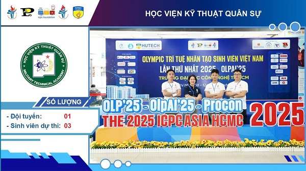 Lễ Tổng kết và trao giải vòng Chung kết Olympic Trí tuệ nhân tạo Sinh viên Việt Nam lần thứ nhất năm 2025 (OlpAI’25) diễn ra vào sáng 10/12 tại Trường Đại học Công nghệ TP. Hồ Chí Minh. Tại sự kiện, Đội VnArmy của Học viện KTQS đã ghi dấu ấn nổi bật khi xuất sắc giành giải Nhì toàn quốc.