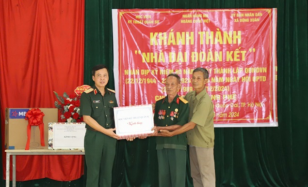 Thiết thực lập thành tích chào mừng kỷ niệm 80 năm Ngày thành lập Quân đội nhân dân Việt Nam (22/12/1944-22/12/2024) và 35 năm Ngày hội Quốc phòng toàn dân (22/12/1989-22/12/2024), ngày 05/8/2024, Học viện KTQS đã phối hợp với Ngân hàng Thương mại cổ phần Quân đội, chi nhánh Hoàng Quốc Việt và Ủy Ban nhân dân xã Đông Xuân, huyện Quốc Oai, thành phố Hà Nội tổ chức lễ khánh thành và bàn giao nhà ‘‘Đại đoàn kết” cho gia đình ông Lê Thanh Phê, sinh năm 1948, cư trú tại thôn Đồng Âm, xã Đông Xuân.