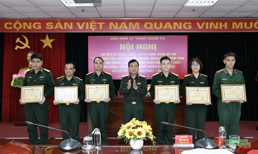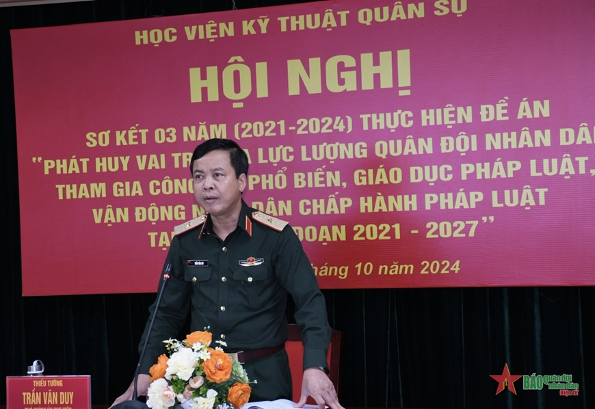 Chiều 23/10, tại Hà Nội, Học viện KTQS tổ chức Hội nghị sơ kết 3 năm (2021- 2024) thực hiện Đề án “Phát huy vai trò của lực lượng Quân đội nhân dân tham gia công tác phổ biến, giáo dục pháp luật (PBGDPL), vận động nhân dân chấp hành pháp luật tại cơ sở giai đoạn 2021 – 2027” (Đề án 1371). Thiếu tướng Trần Văn Duy, Phó chính ủy Học viện chủ trì hội nghị.