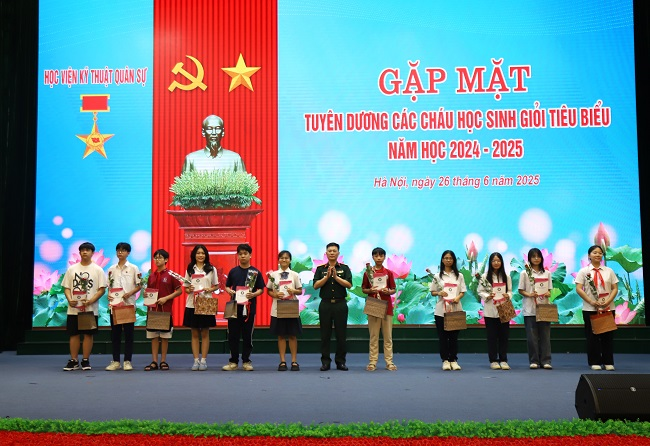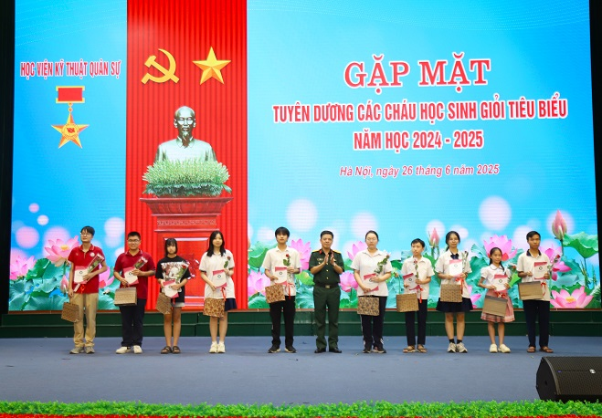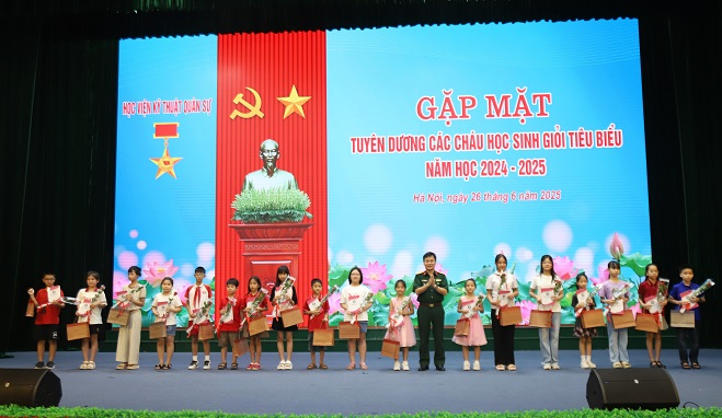 Hưởng ứng Tháng hành động vì trẻ em, Tháng hành động quốc gia phòng, chống bạo lực gia đình và Ngày Gia đình Việt Nam năm 2025, tối 26/6, tại hội trường S5, Học viện KTQS tổ chức gặp mặt, tuyên dương các cháu học sinh giỏi tiêu biểu năm học 2024-2025 là con của các đồng chí cán bộ, giảng viên, nhân viên trong Học viện.