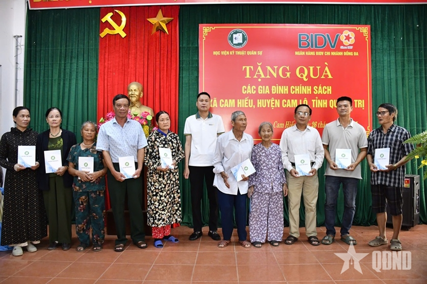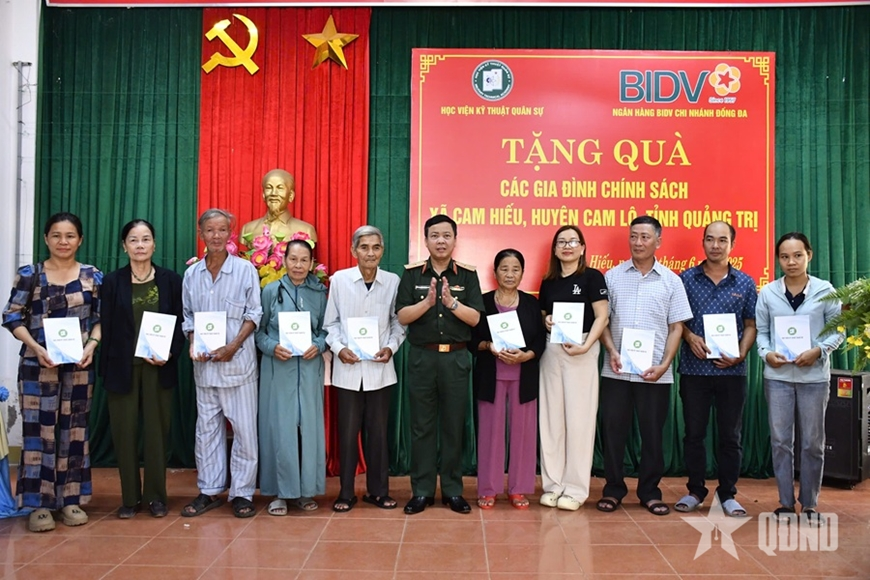 Phát biểu tại buổi trao quà tặng các gia đình chính sách tại tỉnh Quảng Trị, Thiếu tướng Trần Văn Duy, Phó chính ủy Học viện cho biết, trong chuyến hoạt động về nguồn, đoàn công tác với thành phần là các cán bộ Học viện KTQS và Ngân hàng BIDV chi nhánh Đống Đa, TP Hà Nội tổ chức tặng quà các gia đình chính sách và người có công với cách mạng tại xã Cam Hiếu, huyện Cam Lộ, tỉnh Quảng Trị.