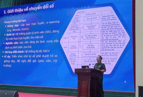 Ngay sau chương trình phát động, Học viện đã tổ chức tập huấn CĐS năm 2025 cho cán bộ, giảng viên, nhân viên trong toàn Học viện. Đợt tập huấn diễn ra trong hai ngày (08-09/10/2025) với năm chuyên đề do giảng viên Viện Công nghệ Thông tin và Truyền thông cùng Văn phòng Học viện giới thiệu. Các chuyên đề tập trung vào nội dung: triển khai phong trào “Bình dân học vụ số” trong Bộ Quốc phòng; công nghệ cốt lõi trong CĐS; bảo đảm an toàn thông tin, an ninh mạng; hướng dẫn sử dụng và quản lý trang bị CNTT; khắc phục sự cố máy tính quân sự. Các nội dung tập huấn được lựa chọn từ những vấn đề quan trọng trong triển khai nhiệm vụ CĐS trong Bộ Quốc phòng nói chung và tại Học viện nói riêng.