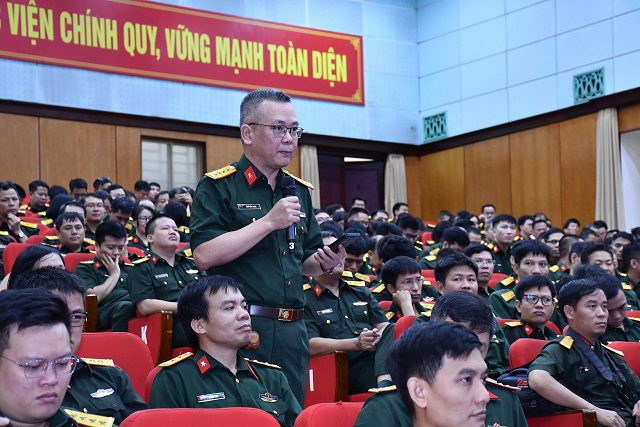 Cũng trong nội dung tập huấn, cán bộ, giảng viên được nghe TS Nguyễn Việt Sơn giới thiệu về sử dụng phần mềm NotebookLM phục vụ xây dựng bài giảng, slide giảng bài, tạo bộ câu hỏi trắc nghiệm và nhiều kinh nghiệm hữu ích khác. Đại tá Lê Hoàng Hải – Phó Trưởng phòng Khoa học quân sự đã giới thiệu những nội dung cơ bản về các chính sách mới trong lĩnh vực khoa học, công nghệ, đổi mới sáng tạo và chuyển đổi số được nêu trong các văn bản: Luật số 93/2025/QH15, Nghị quyết số 193/2025/QH15 của Quốc hội Khóa XV và Nghị định số 88/2025/NĐ-CP của Chính phủ.