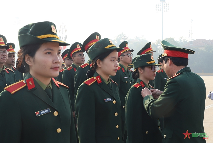 Lãnh đạo Học viện KTQS gắn huy hiệu Bác Hồ tặng các học viên Khóa 54
