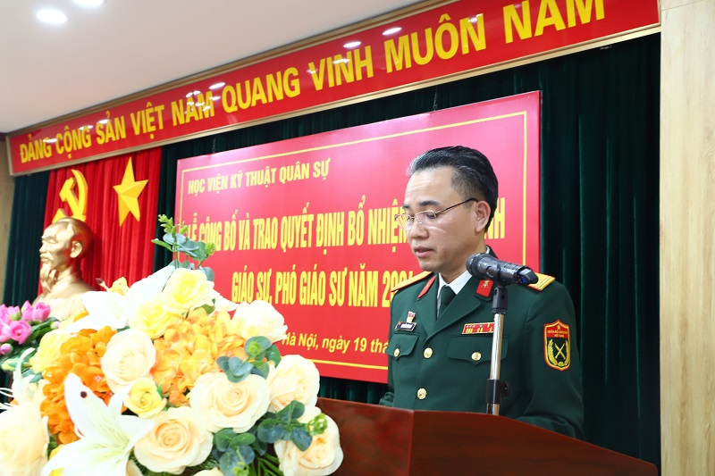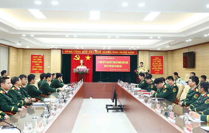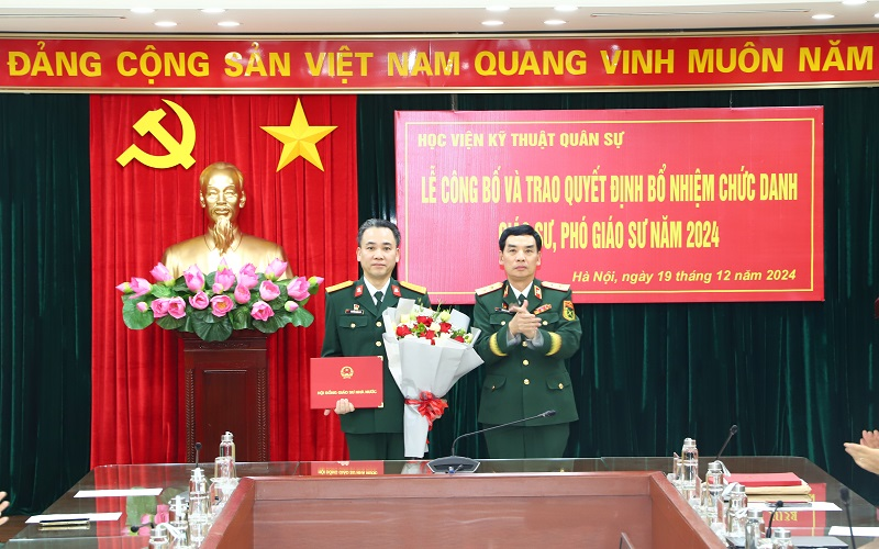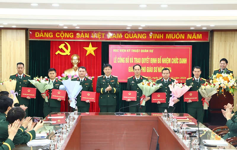 Chiều 19/12/2024, trong không khí phấn khởi chào mừng kỷ niệm 80 năm ngày thành lập Quân đội Nhân dân Việt Nam (22/12/1944 – 22/12/2024), 35 năm Ngày hội Quốc phòng toàn dân, Học viện KTQS đã long trọng tổ chức Lễ công bố và trao Quyết định bổ nhiệm chức danh Giáo sư (GS), Phó Giáo sư (PGS) năm 2024 cho 07 nhà giáo. Tham dự buổi Lễ có các đồng chí trong Đảng ủy, Ban Giám đốc Học viện, chỉ huy các cơ quan, đơn vị cấp đầu mối trực thuộc Học viện.