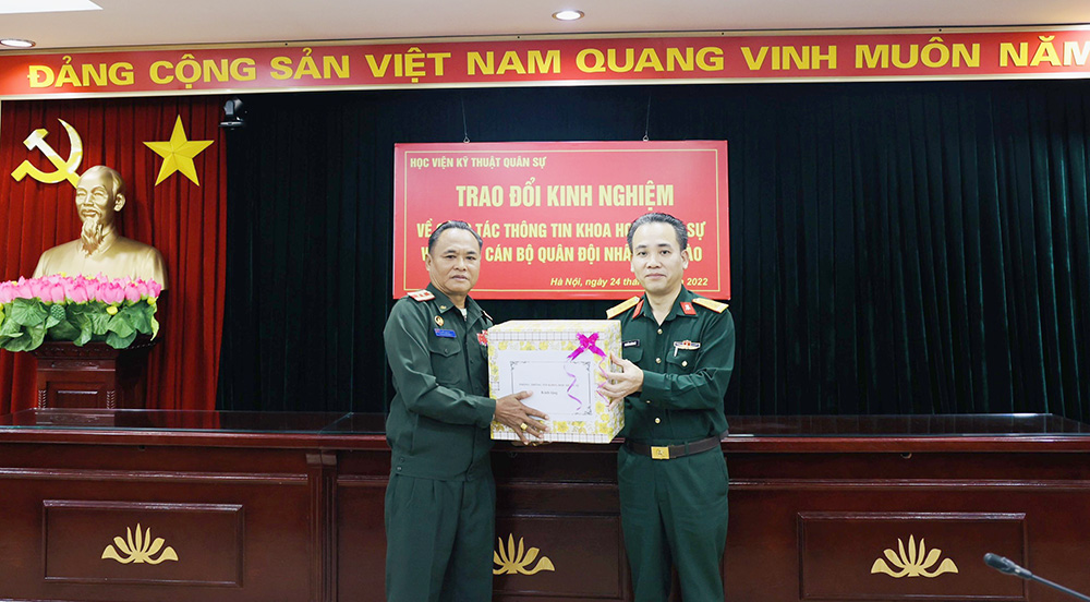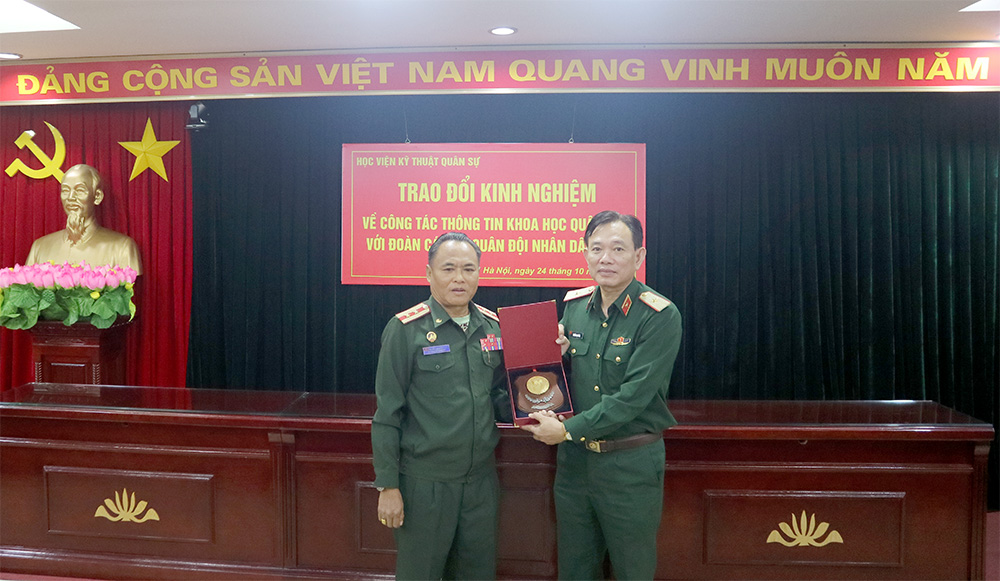 Thực hiện ý kiến chỉ đạo của Thượng tướng Hoàng Xuân Chiến – Thứ trưởng BQP và Kế hoạch tập huấn công tác Thông tin KHQS về việc tổ chức lớp tập huấn công tác Thông tin KHQS cho cán bộ QĐND Lào năm 2022, ngày 24/10/2022, Đoàn cán bộ QĐND Lào do Trung tá KHOUMALA SOMEUANG làm Trưởng Đoàn đã đến Học viện KTQS để trao đổi kinh nghiệm về việc tổ chức, triển khai thực hiện công tác Thông tin KHQS. Đi cùng Đoàn có Đại tá Đỗ Hồng Việt – Phó Giám đốc Trung tâm Thông tin KHQS/BQP và các cán bộ Trung tâm Thông tin KHQS.