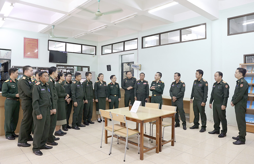 Trong khuôn khổ buổi làm việc, Đoàn cán bộ QĐND Lào và Học viện KTQS đã chụp ảnh lưu niệm, tặng quà và cùng tham quan Thư viện Học viện KTQS.