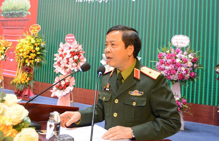 Thiếu tướng Trần Văn Duy, Phó chính ủy Học viện Kỹ thuật Quân sự phát biểu tại hội nghị