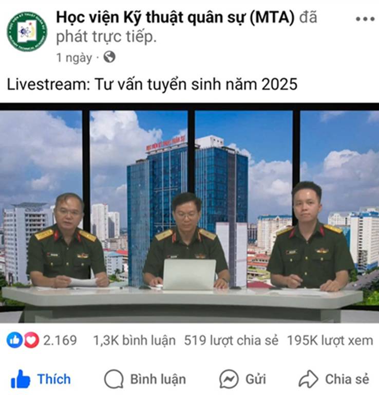 Sáng ngày 07/6/2025, Học viện Kỹ thuật quân sự đã tổ chức chương trình livestream tư vấn tuyển sinh đại học năm 2025. Chương trình được phát sóng trực tiếp trên trang Facebook Học viện Kỹ thuật quân sự (MTA) và kênh Youtube Tuyển sinh Học viện Kỹ thuật quân sự, thu hút sự quan tâm của đông đảo quý vị phụ huynh và các em học sinh trên cả nước.